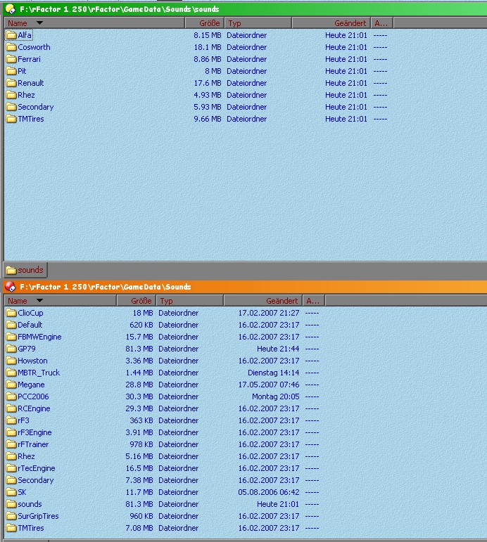 Neenee, hat Timo mich auch grad gefragt. Es ist beim GP79-Mod. Mir ist aufgefallen, das nach der Installation (is'n Installer), zusätzlich einen ordner SOUNDS in dem ordner SOUNDS kopiert wird, also doppelt, einmal richtig, einmal falsch demnach, aber egal wie man es macht, die eigenen und die der anderen Geräusche des Motors hört man nicht.